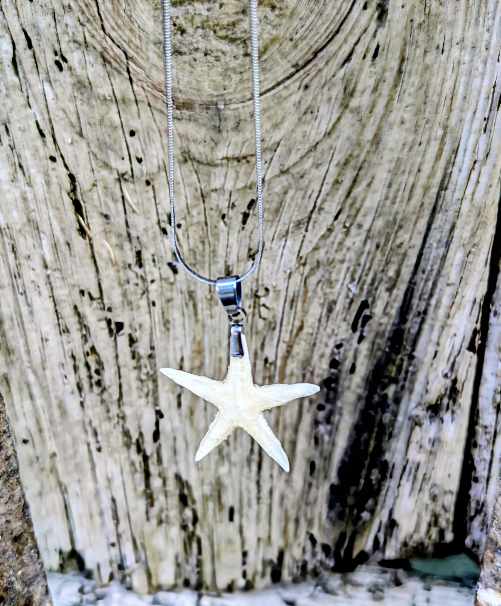 Este colgante está elaborado con auténtica estrella de mar, preservando su forma y color para que luzcan como recién encontrada. Cada pieza es única, ya que ninguna estrella es igual a otra, aportando un toque especial y artesanal a tu look.