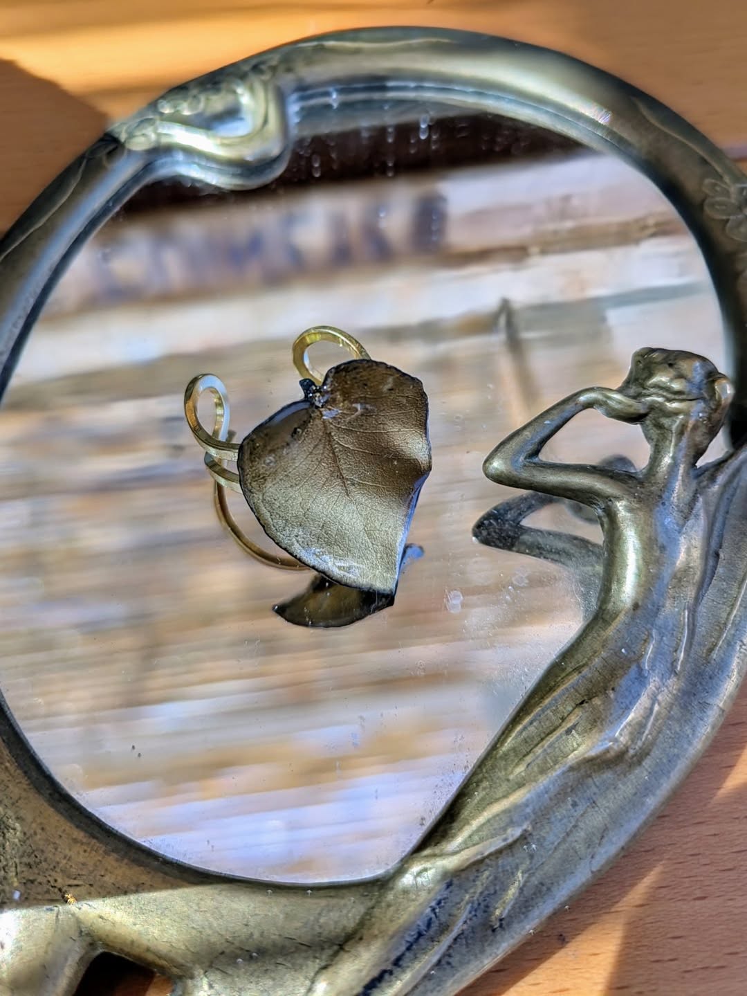 La hoja se presenta en una montura de acero inoxidable, un material resistente, hipoalergénico y que no se oscurece con el tiempo. Su acabado fino y ligero realza la delicadeza del diseño, convirtiéndolo en un complemento perfecto para amantes de la naturaleza, los detalles florales y la joyería original.