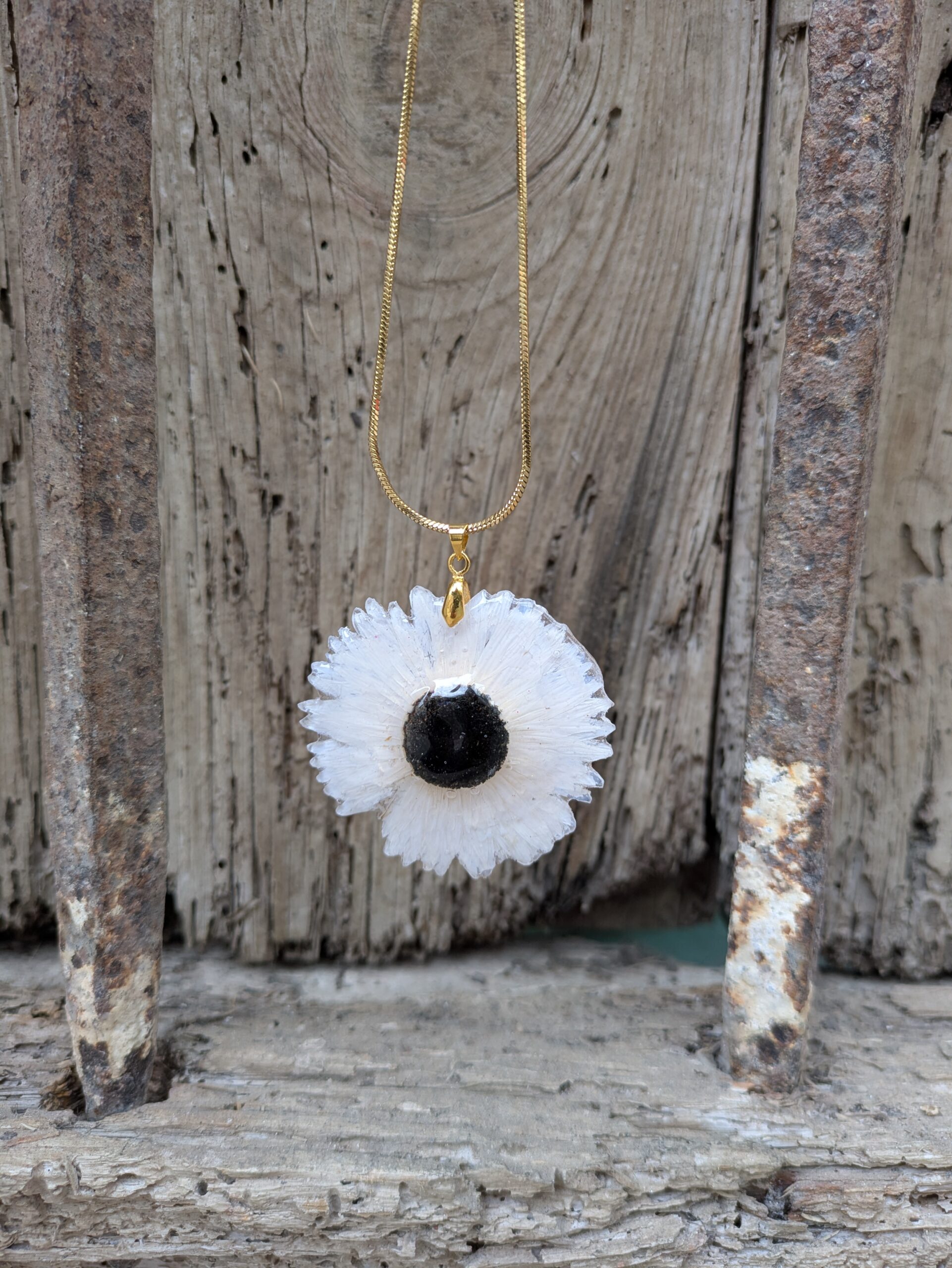 Este collar está elaborado con auténtica flor natural encapsuladas en un polímero transparente, preservando su forma y color para que luzcan como recién cortadas. Cada pieza es única, ya que ninguna flor es igual a otra, aportando un toque especial y artesanal a tu look.