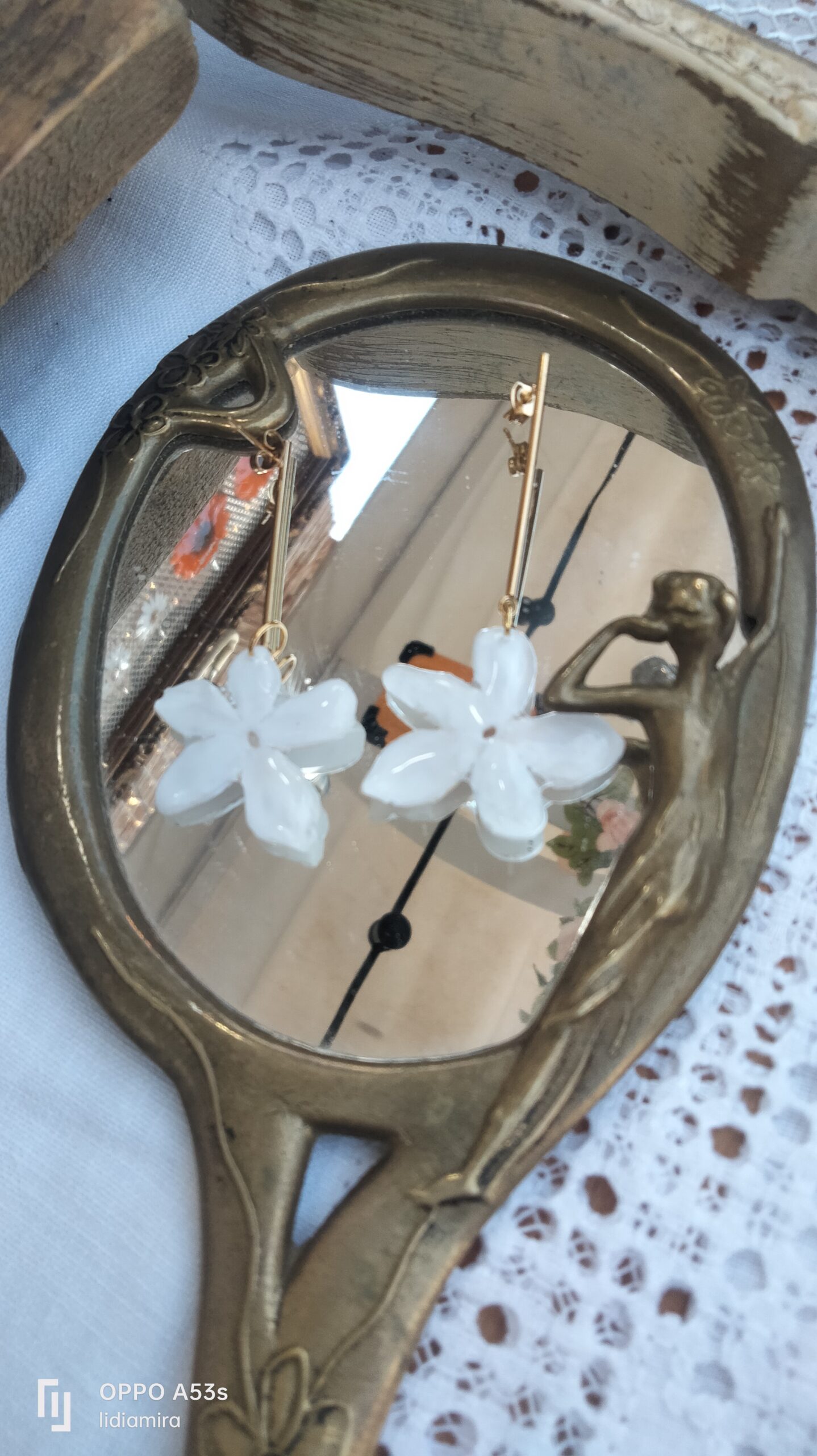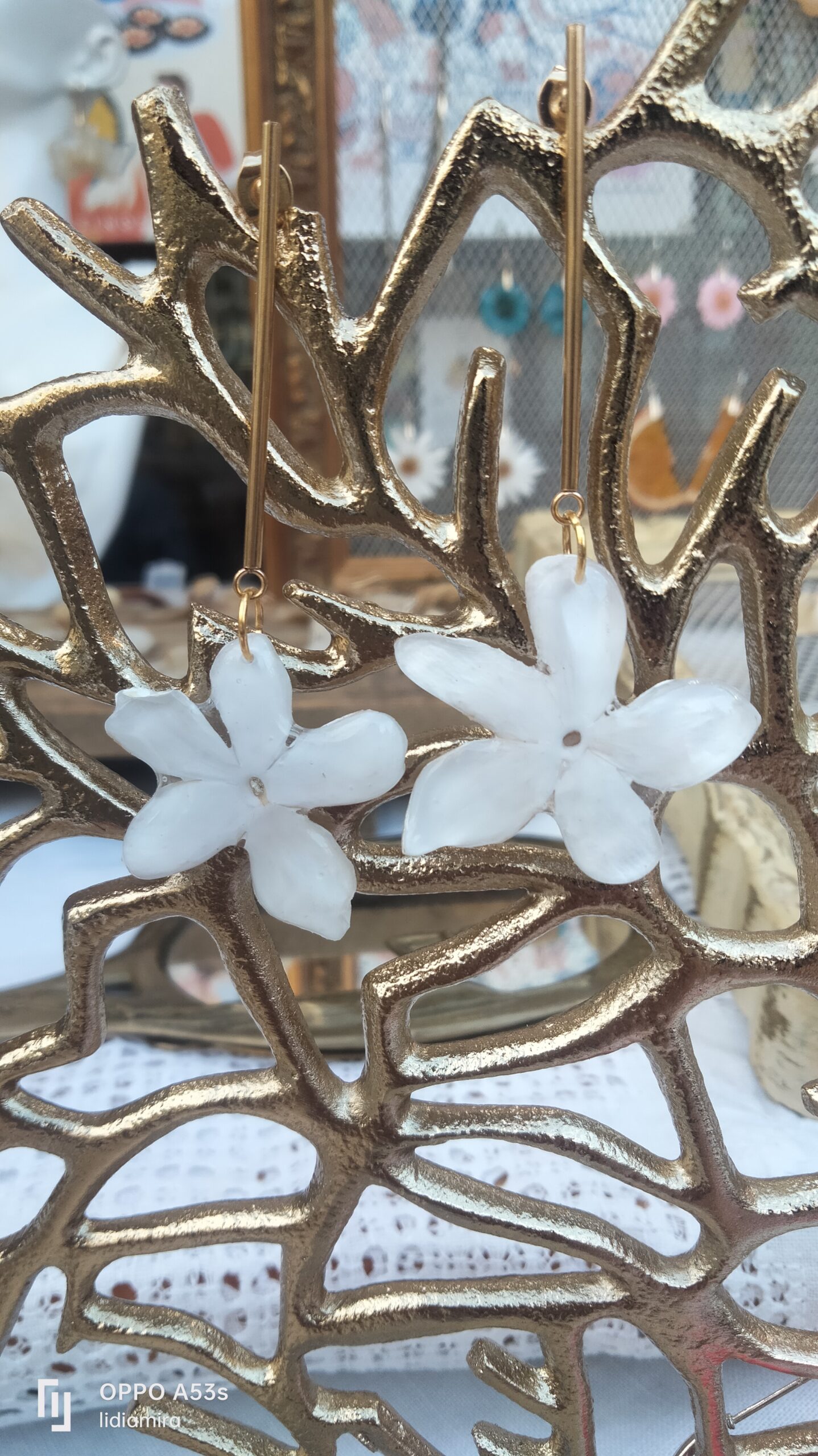 Estos pendientes están elaborados con auténticos jazmines naturales encapsulados en un polímero transparente, preservando su forma y color para que luzcan como recién cortadas. Cada pieza es única, ya que ninguna flor es igual a otra, aportando un toque especial y artesanal a tu look.