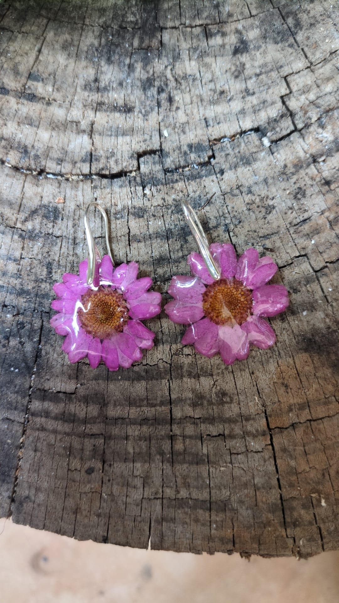 Estos pendientes están elaborados con auténticas margaritas naturales encapsuladas en un polímero transparente, preservando su forma y color para que luzcan como recién cortadas. Cada pieza es única, ya que ninguna flor es igual a otra, aportando un toque especial y artesanal a tu look.