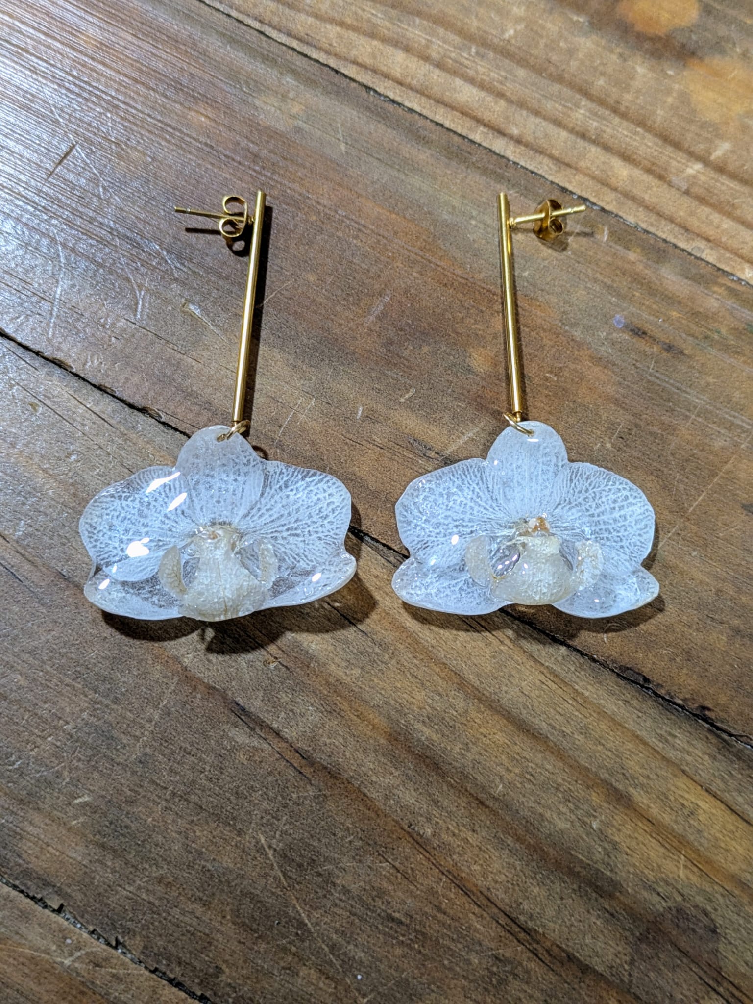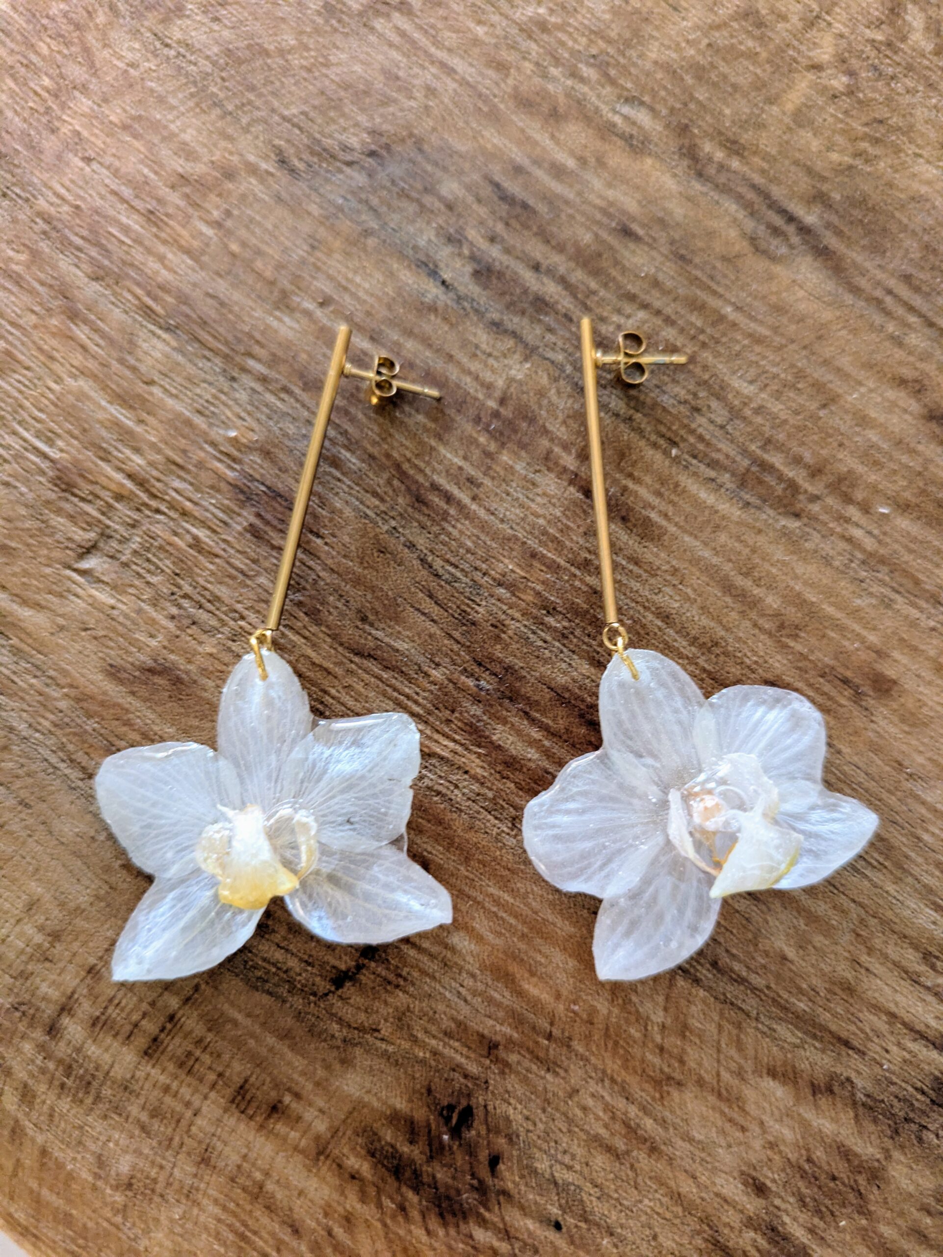 Estos pendientes están elaborados con auténticas orquídeas naturales, preservando su forma y color para que luzcan como recién cortadas. Cada pieza es única, ya que ninguna flor es igual a otra, aportando un toque especial y artesanal a tu look.